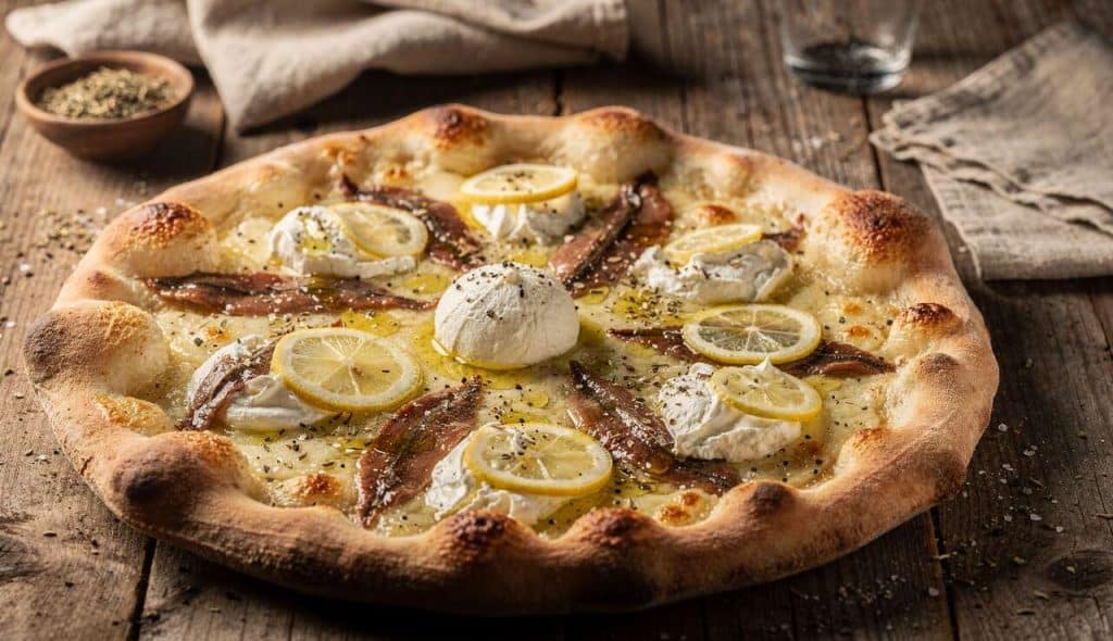 L’association du citron et de la burrata avec les anchois est typique de la cuisine méditerranéenne, où l’on recherche l’équilibre entre acidité, douceur et salinité. Un véritable voyage culinaire au bord de la mer.